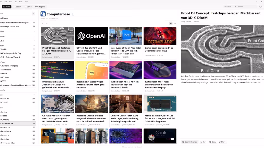 The app features a modern multi-panel layout that enables quick navigation between sources, headlines, and full article views.